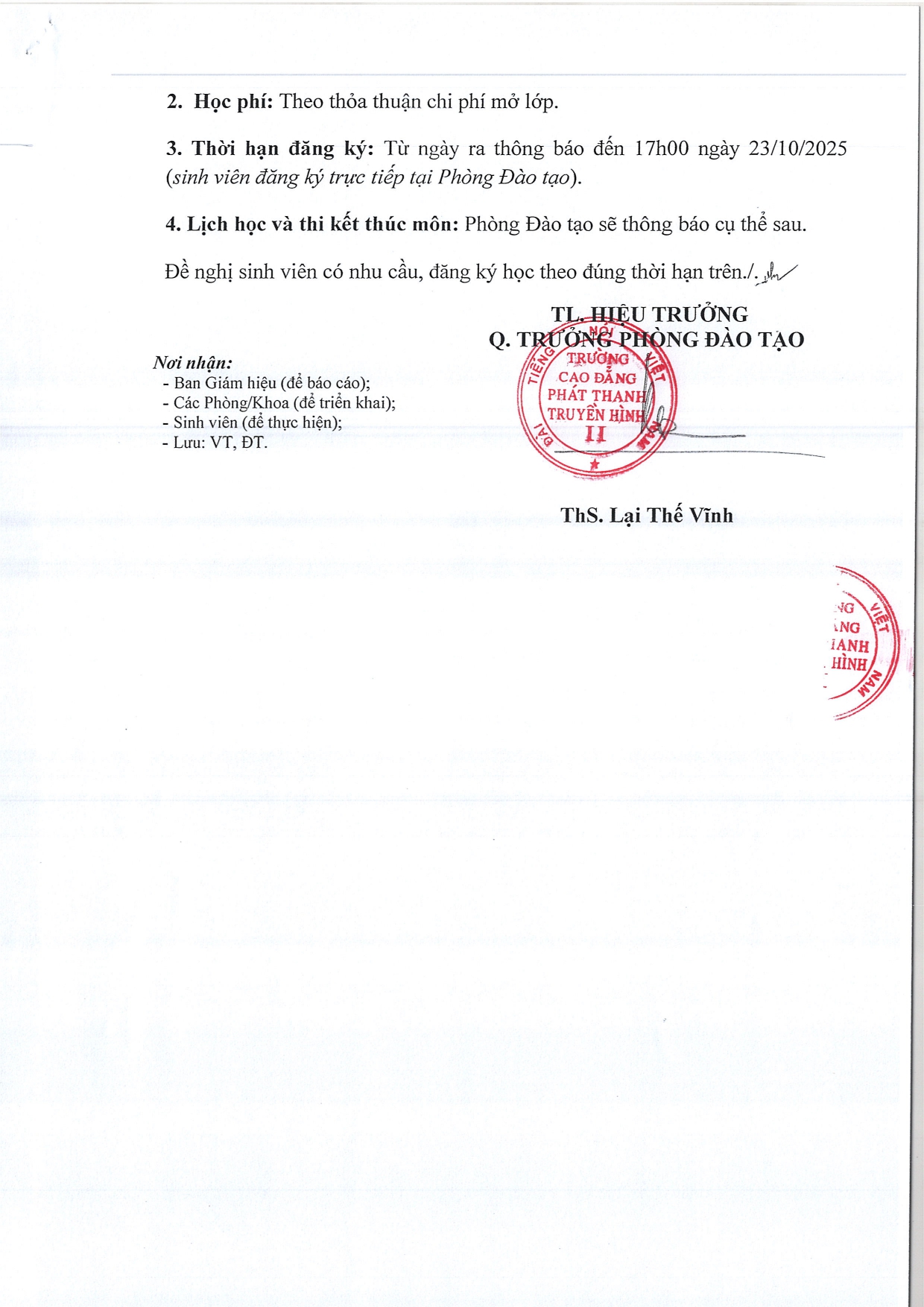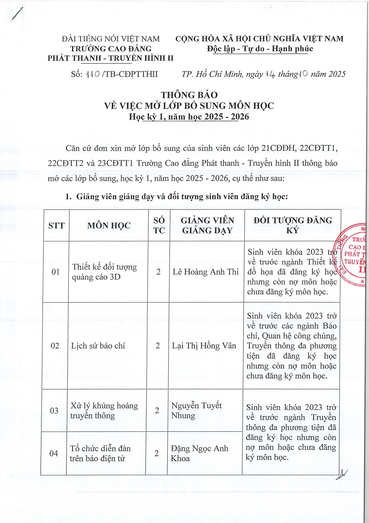 Thông báo về việc mở lớp bổ sung môn học học kỳ 1, năm học 2025-2026